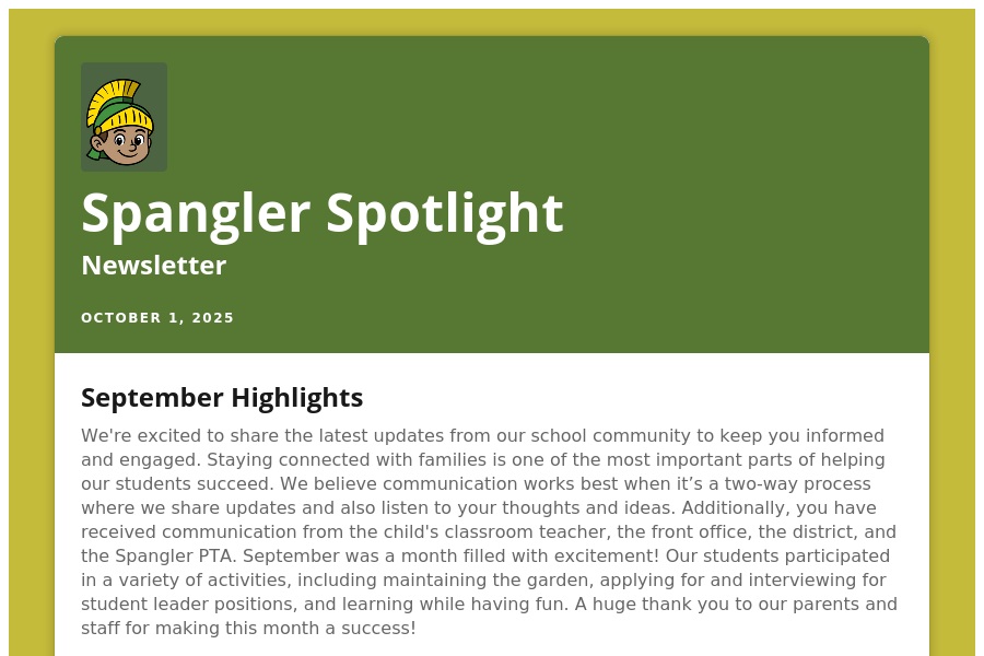 Spangler Spotlight Newsletter October 1, 2025 September Highlights We're excited to share the latest updates from our school community to keep you informed and eng. . .