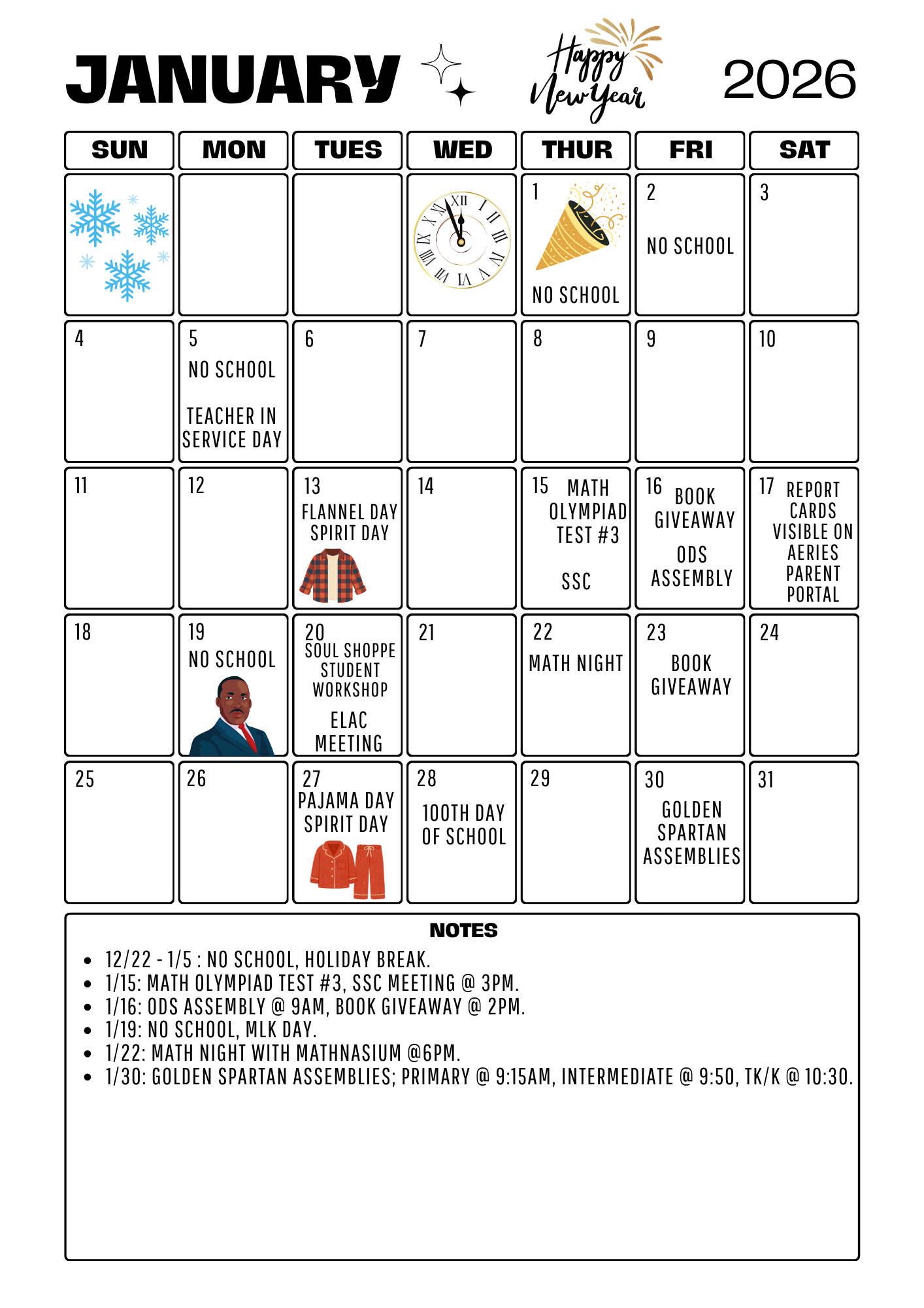 Happy New Year! Attached is our January calendar and some student leadership flyers.